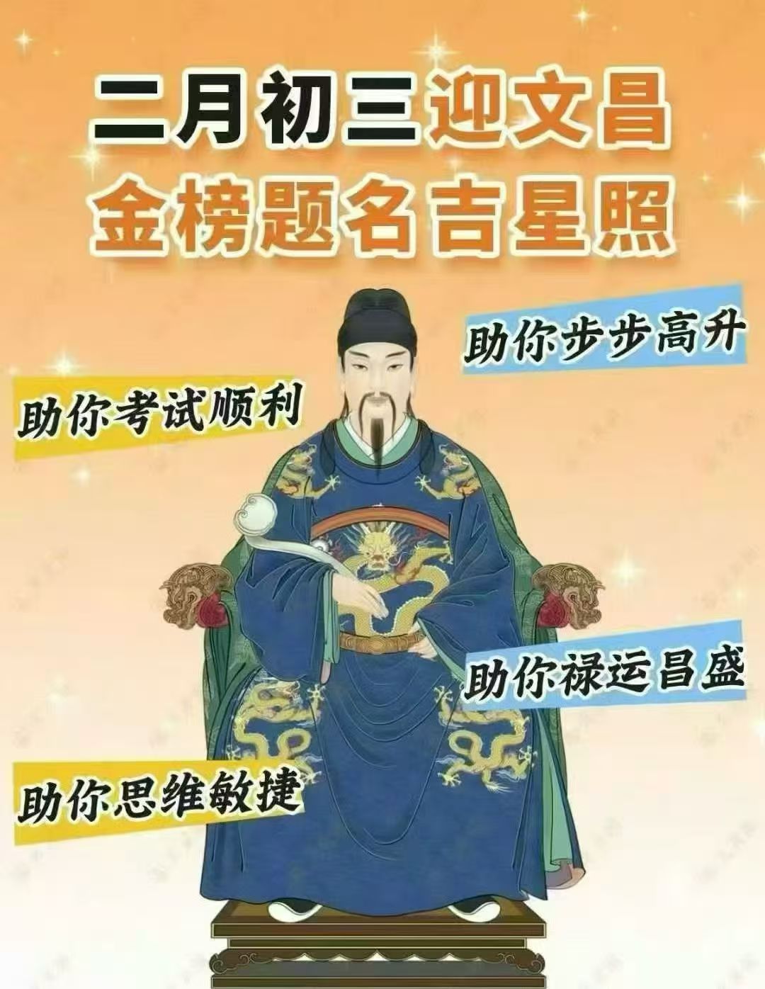 农历二月初三文昌帝君圣诞 ,文昌帝君为世间掌管功名禄位之神。千百年来,凡求科甲及第,谋求功名之人,莫不虔诚供奉文昌帝君,以祈增慧开智,金榜高中,福荫门庭。